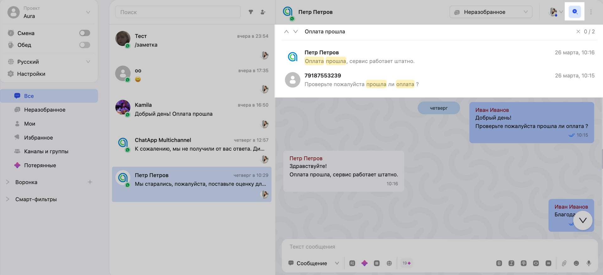 Если выбрать «Все» — отобразятся все чаты, где учавствует сотрудник.