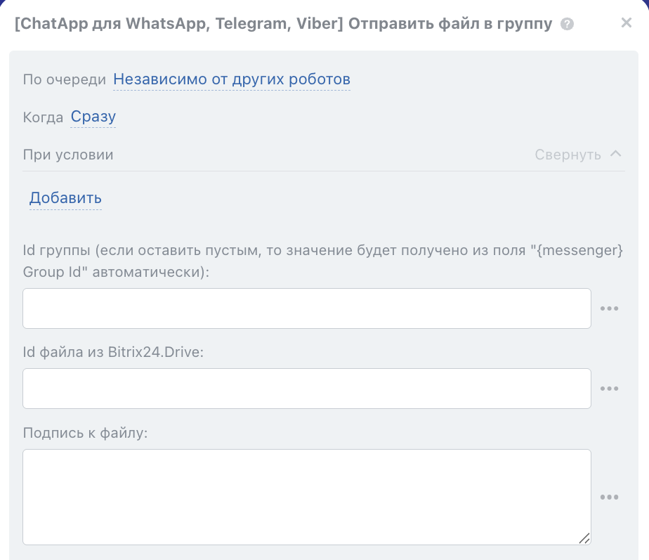 Шаг 4. Выберите робота [ChatApp для WhatsApp, Telegram, Viber] — «Отправить файл в группу».