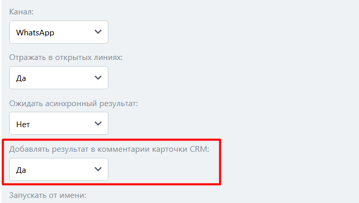Чтобы активировать эту опцию, перейдите в настройки робота и в пункте «Добавлять результат в комментарии карточки CRM» выберите «Да»: