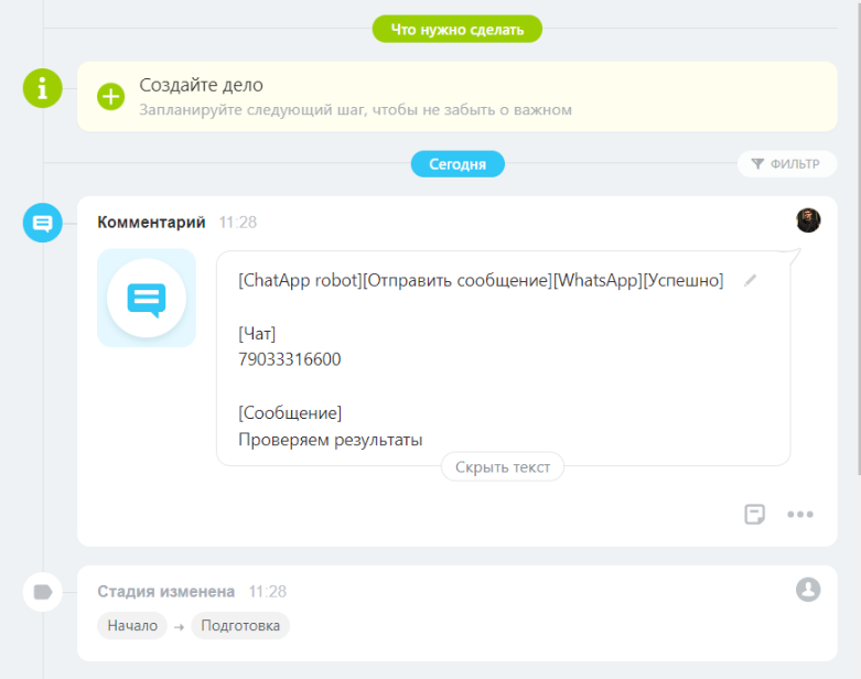 4. Результат работы робота отобразится в комментариях смарт-процесса: