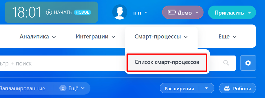 1. Чтобы создать смарт-процесс, откройте раздел «CRM» и вкладку «Смарт-процессы».