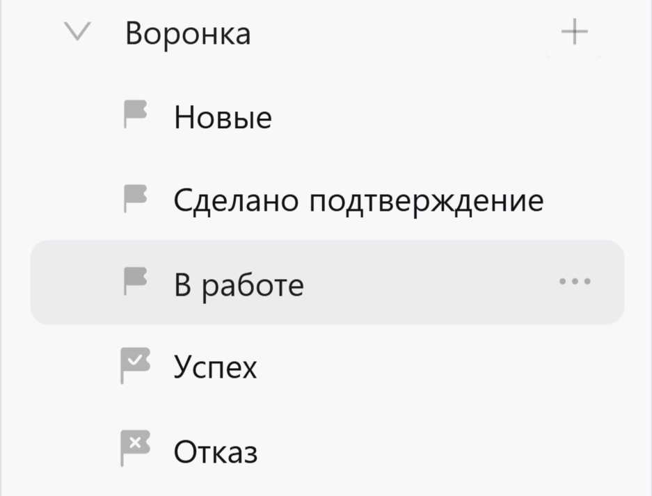 d). Переместить вниз/вверх — нажмите и перемещайте стадию в режиме drag&drop. Стадии «Успех» и «Отказ» неперемещаемы, пользовательские стадии нельзя переместить ниже их.