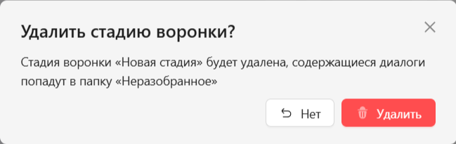 При подтверждении стадия будет удалена из списка. Для диалогов с этой стадией будет установлена стадия по умолчанию — «Неразобранное».