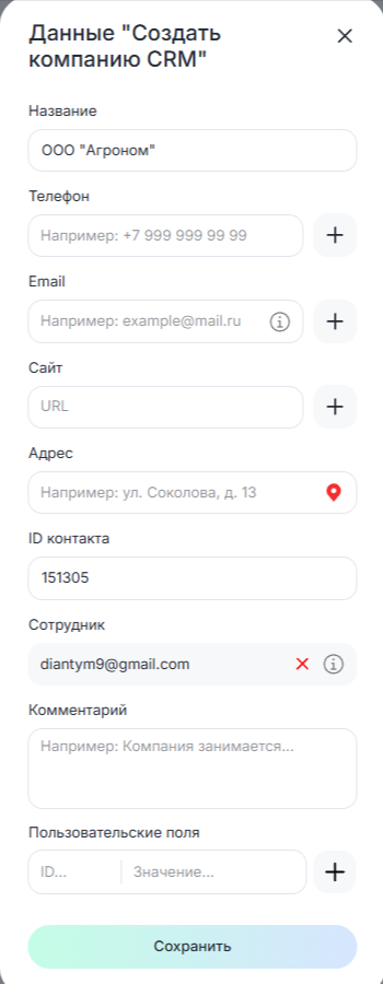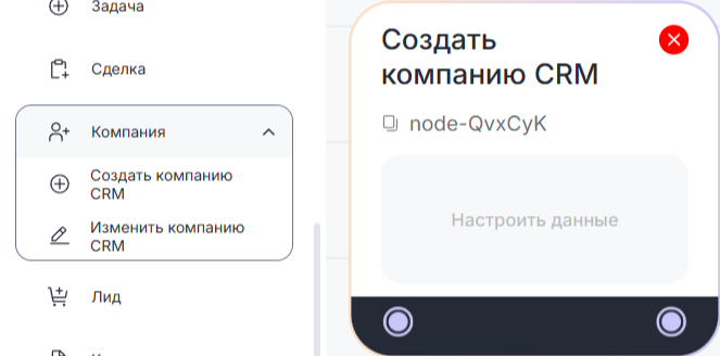 Блок «Создать компанию CRM» позволяет автоматизировать создание компании в CRM-системах.