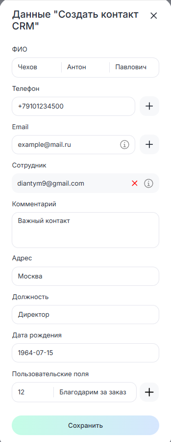 Когда сценарий дойдет до этого блока, в CRM-системе будет создана карточка контакта.