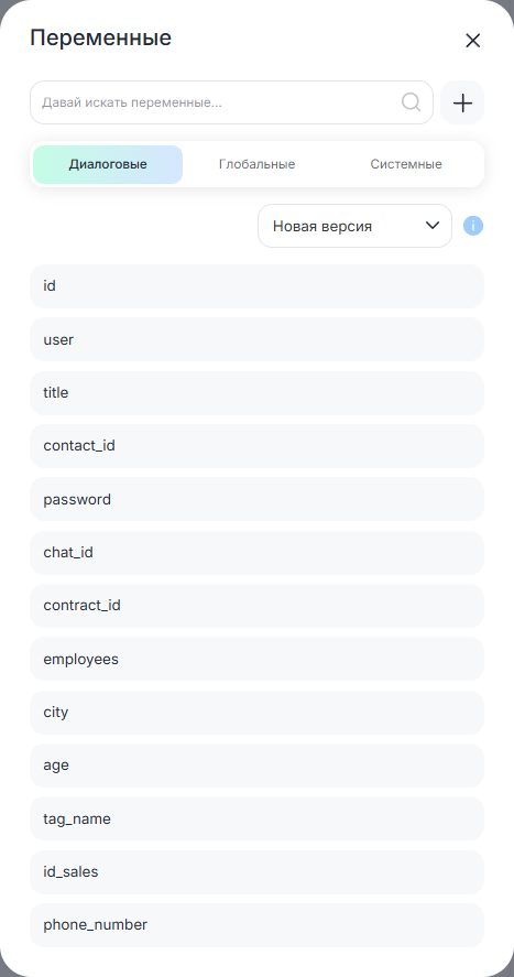 2. Создайте диалоговую переменную для каждого поля. Подробнее о создании переменных читайте в статье «Переменные и константы«.