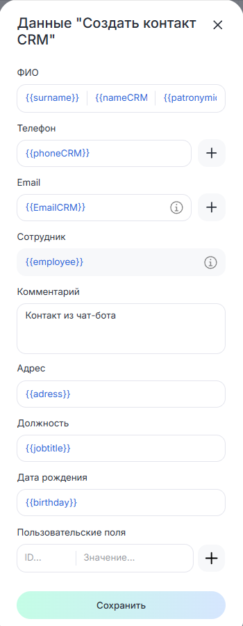 В диалоге бота с клиентом блок «Создать контакт CRM» автоматически создает карточку контакта в CRM-системе.