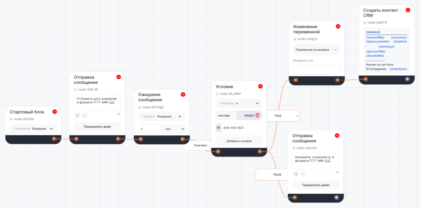Чтобы уточнить запросы данных от клиентов, можно добавить в сценарий блок «Условие». Например, дата рождения в формате YYYY-MM-DD. Добавьте блок «Условие» и впишите в него регулярное выражение — d{4}-d{2}-d{2} . Выведите две стрелки «True» — если клиент ввел все правильно и «False» — если клиент ввел дату неверно. Должно получиться как на скриншоте: