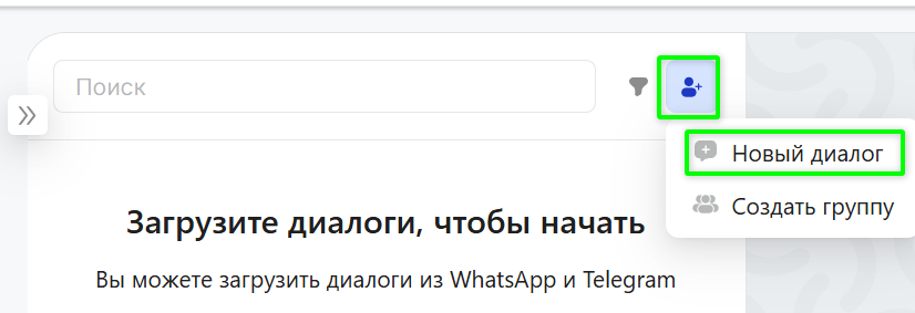 - Нажмите на значок человека и выберите «Новый диалог».