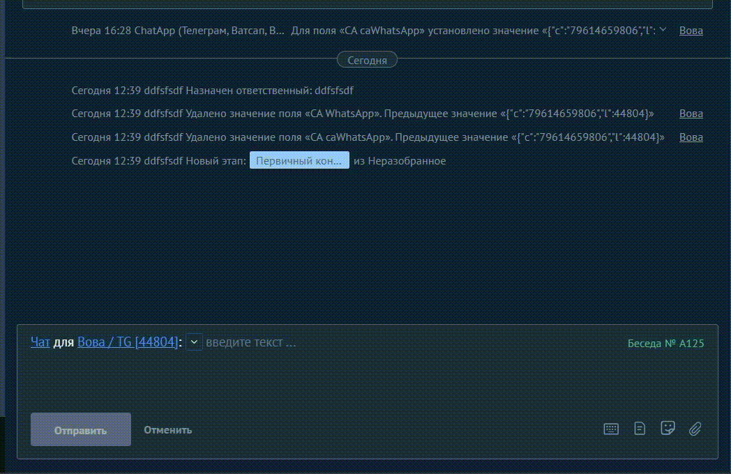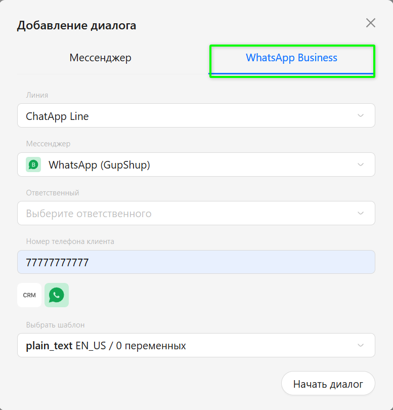 - Выберите WhatsApp Business, укажите мессенджер, при необходимости назначьте ответственного (необязательный шаг), введите номер телефона клиента и выберите шаблон для отправки сообщения.