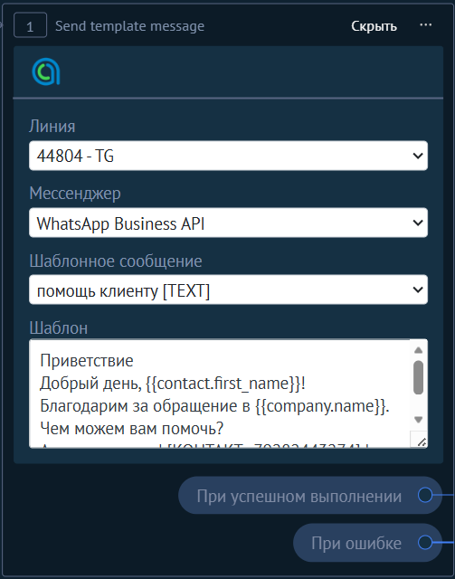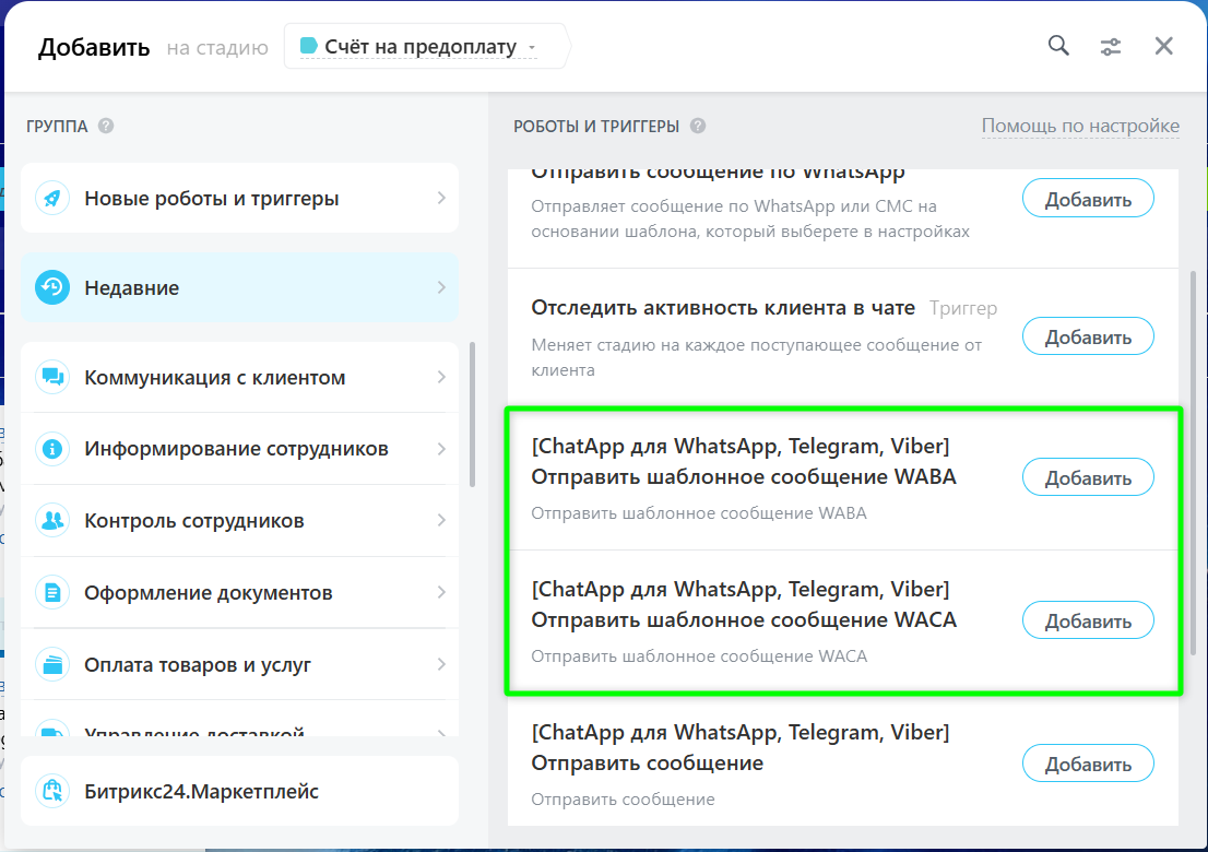 Добавьте робот [ChatApp для WhatsApp, Telegram, Viber] Отправить шаблонное сообщение WABA или [ChatApp для WhatsApp, Telegram, Viber] Отправить шаблонное сообщение WACA (в зависимости от подключённого канала).