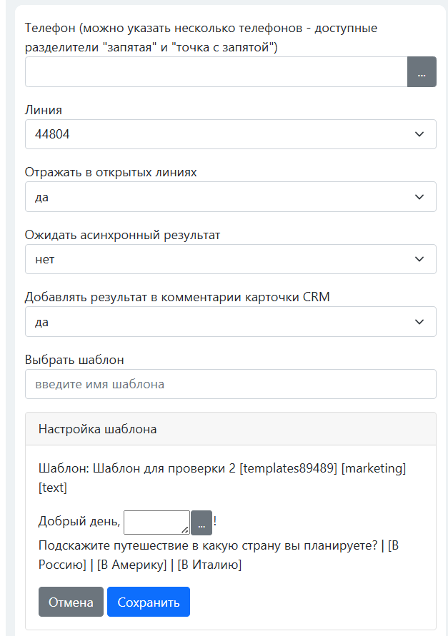 Заполните переменные шаблона (допускается использование полей CRM).