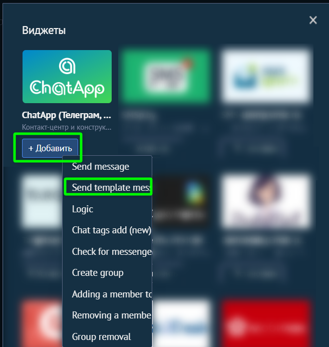 Добавьте виджет ChatApp для WhatsApp и Telegram и выберите Send template messages.