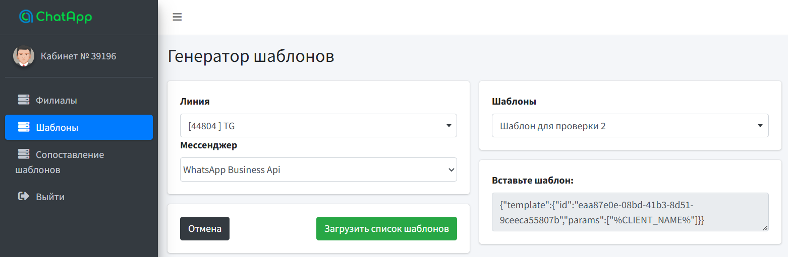 Выберите линию, мессенджер и нажмите «Получить список шаблонов».