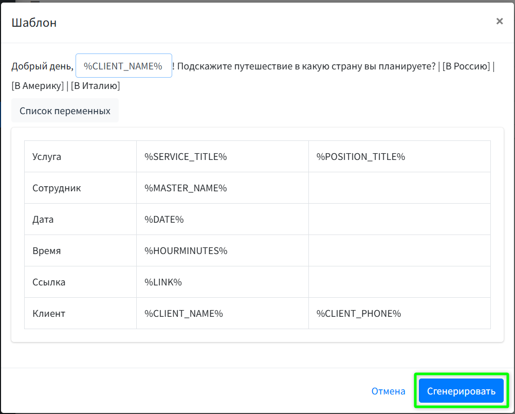 Заполните переменные и нажмите «Сгенерировать».