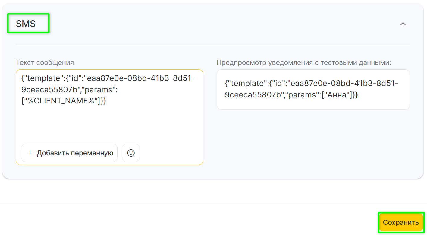 Выберите тип SMS и укажите код шаблона, сгенерированный в инструкции выше и нажмите «Сохранить».