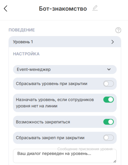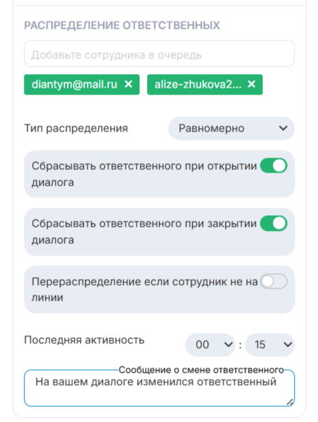 настройте повторное распределение, если ответственный сотрудник отсутствует на линии, и при необходимости задайте время отсутствия, после которого диалоги будут перераспределены;