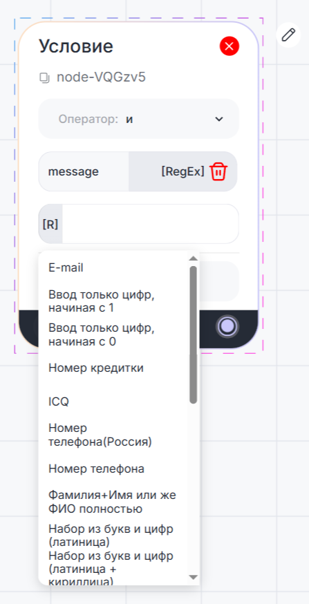 Регулярное выражение вводится в поле в соответствии с правилами языка, либо выбирается из списка готовых.