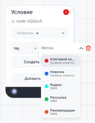 3. Нажмите в поле «Метки» — появится список меток из привязанной к сценарию компании. Добавьте нужную метку.