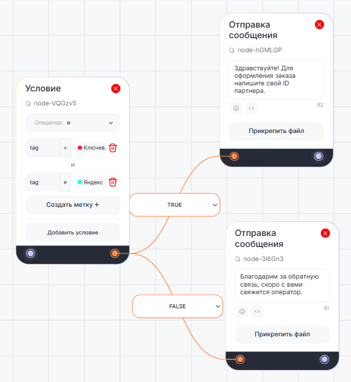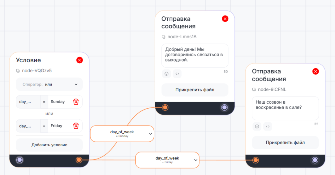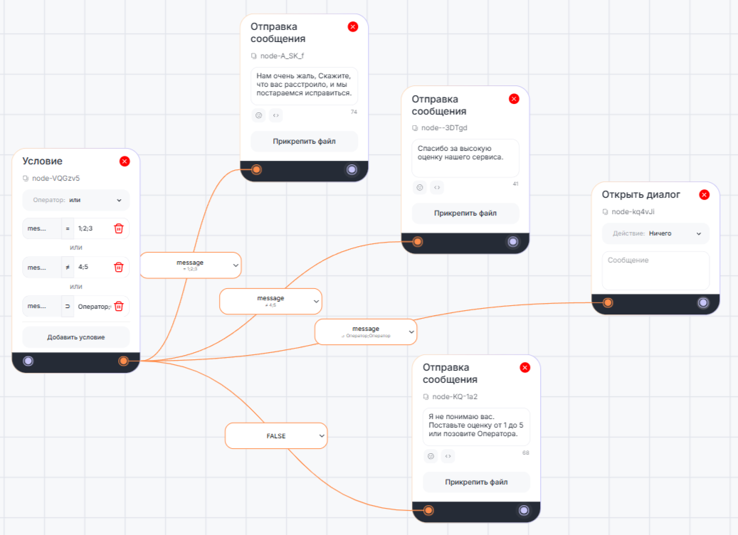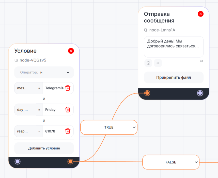 - если выполняется несколько условий, бот переходит по ветке того условия, которое сработало первым.