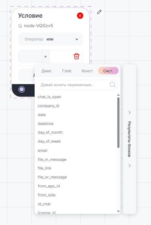 В зависимости от типа выбранной переменной (целое число или строка) будут доступны следующие типы условий: