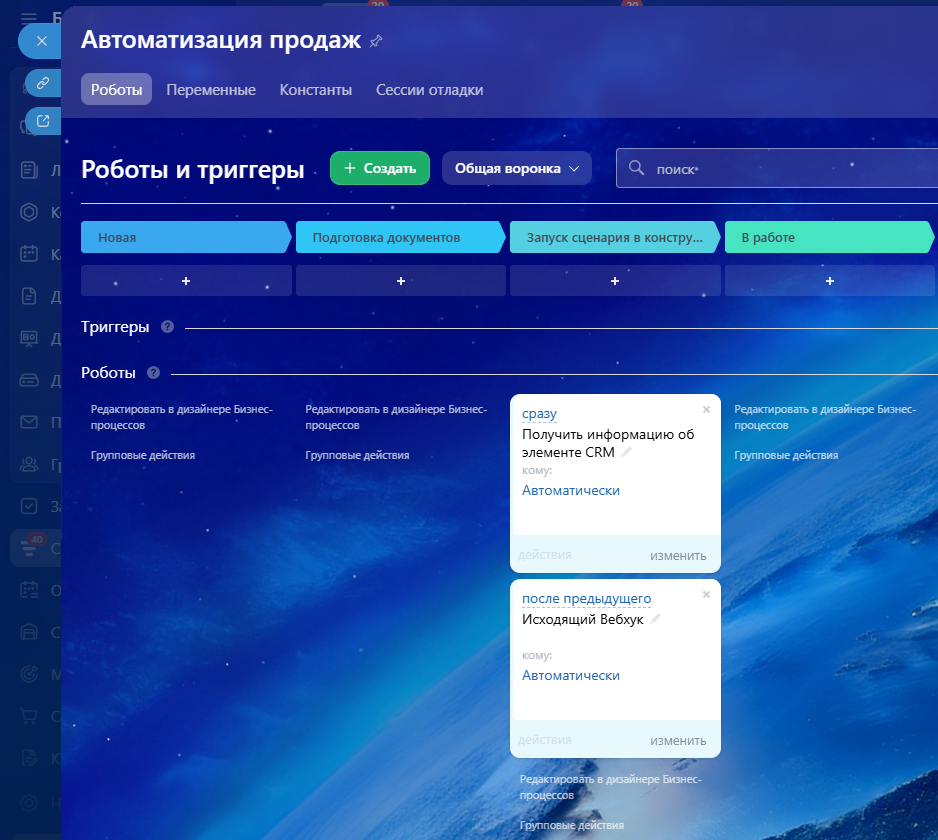 - Перейдите в Битрикс24 → «CRM» → «Сделки» → «Роботы».
