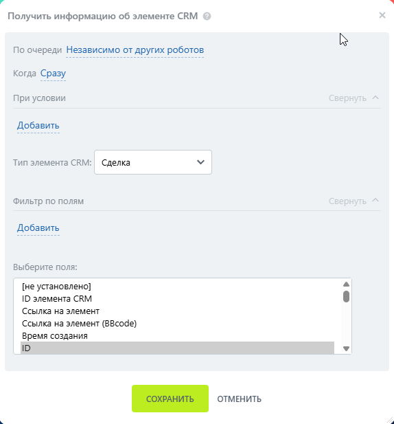 - Настройка робота «Получить информацию о элементе CRM»