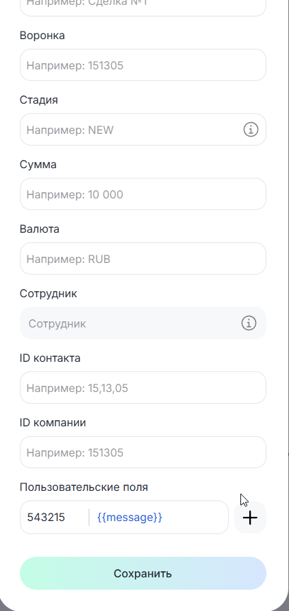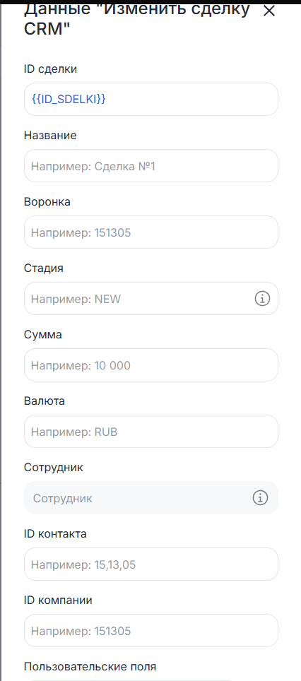 Создайте блок «Изменить сделку CRM», который будет передавать полученную информацию в сделку.