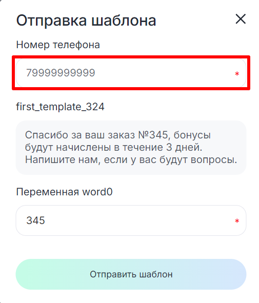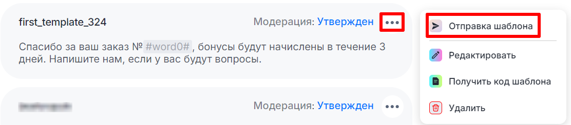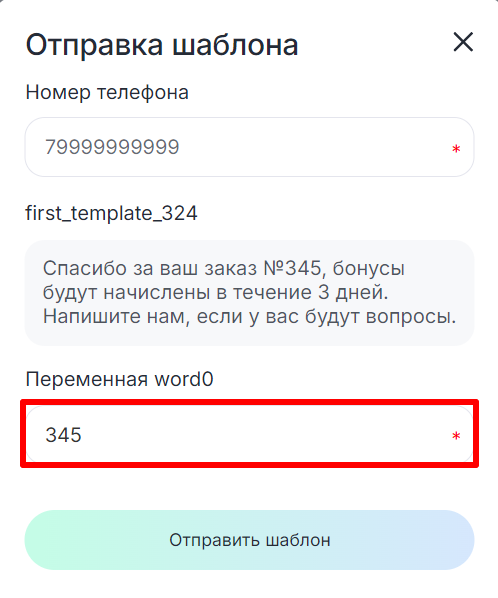 1. Нажмите «Перейти к шаблонам». Напротив нужного шаблона нажмите на три точки — «Отправка шаблона». В окне отправки шаблона укажите телефон получателя в поле «Номер телефона». Укажите значение переменных в поле «Переменная».