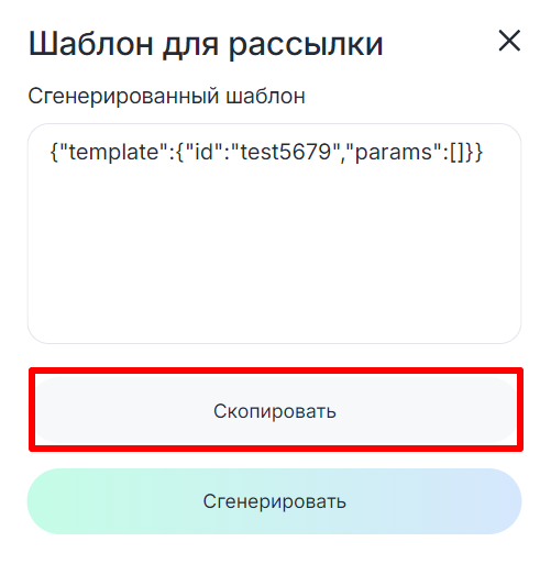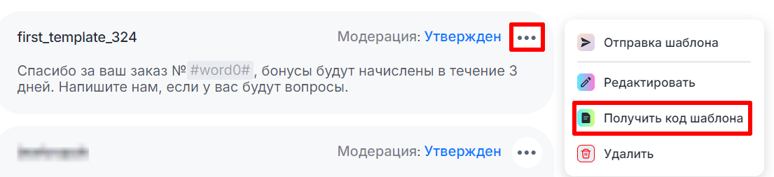 Шаг 1. Нажмите на три точки справа от названия шаблона → выберите «Получить код шаблона» → в новом окне нажмите «Сгенерировать» → если в шаблоне есть переменные, заполните их значения. Затем скопируйте код шаблона, нажав «Скопировать».