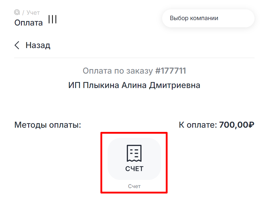 5. Выберите метод оплаты. Доступна только оплата по счету.