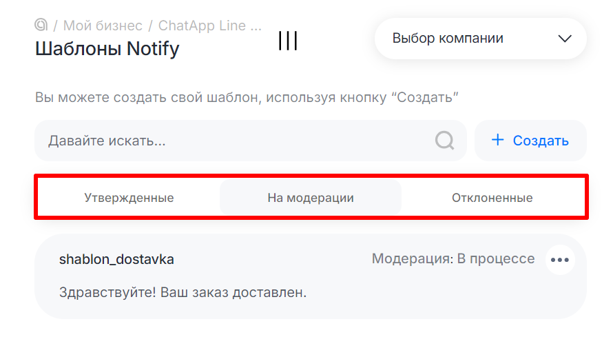 9. После отправки на согласование, шаблон попадет в категорию «На модерации». Если он будет одобрен — в «Утвержденные», если отклонен — в «Отклоненные». Уведолмения о статусах шаблонов будут также приходить на Email.