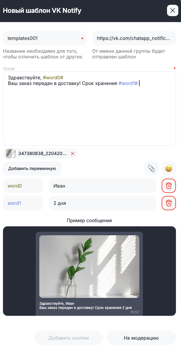 Нажмите «Добавить переменную» чтобы добавить переменную, укажите значение переменной. Если планируете использовать кнопки в шаблоне, на линии с VK Notify должно быть подключено сообщество ВКонтакте. Если подключён только VK Notify, кнопки будут недоступны — в этом случае отправляйте шаблон на модерацию.