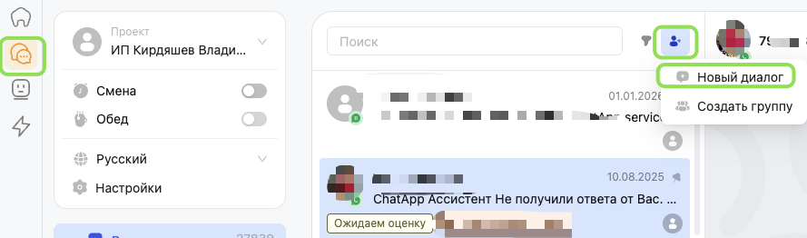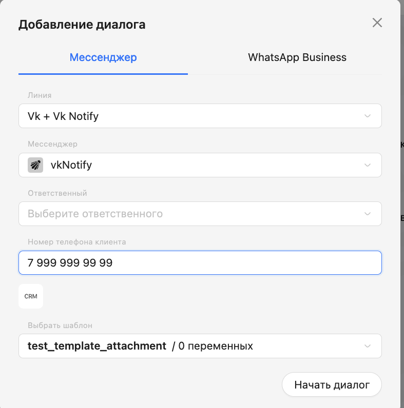 1. Перейдите в раздел Scenario Dialogs в левом боковом меню личного кабинета и нажмите «Новый диалог». Выберите линию, на которой подключён VK Notify  → мессенджер VK Notify  → ответственного за диалог  → номер телефона пользователя. Затем выберите шаблон из списка и нажмите «Начать диалог».