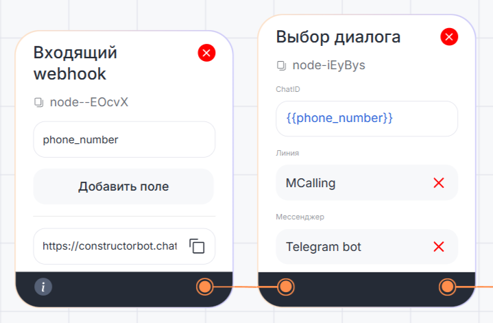 phone_numberчерез webhook. - Блок «Выбор диалога» получает значение переменной.