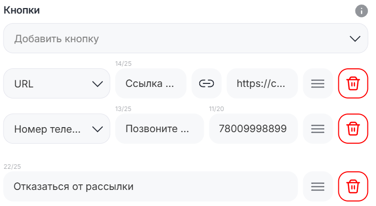 Максимум 2 кнопки. - Номер телефона — звонок по указанному номеру