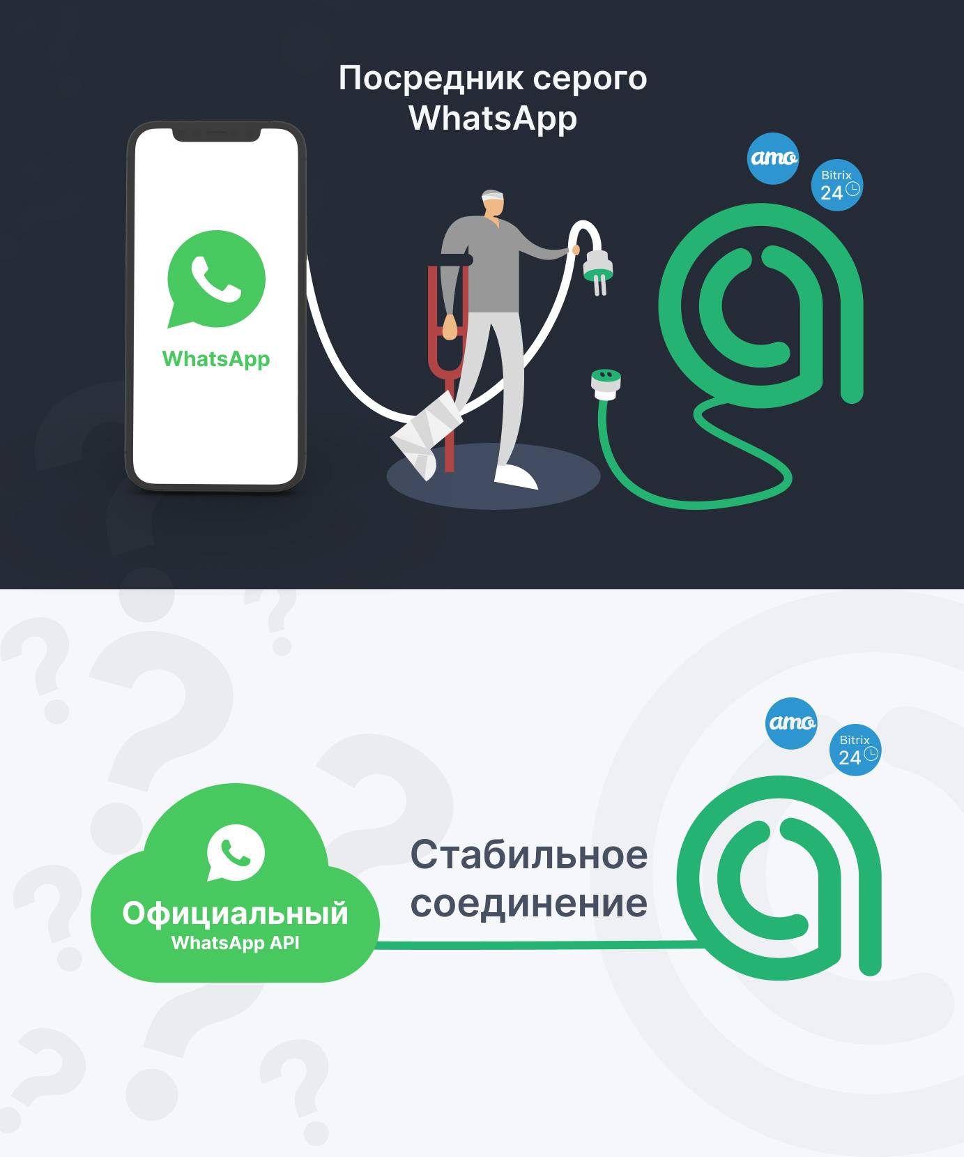 Это нелегальное подключение в нарушение пользовательского соглашения WhatsApp. Meta* отслеживает и блокирует таких провайдеров. Кроме того, WhatsApp постоянно обновляет свои алгоритмы, и провайдерам нужно время, чтобы обновить свои. В такие периоды происходят сбои: интеграция не работает, нужно заново сканировать QR-код.