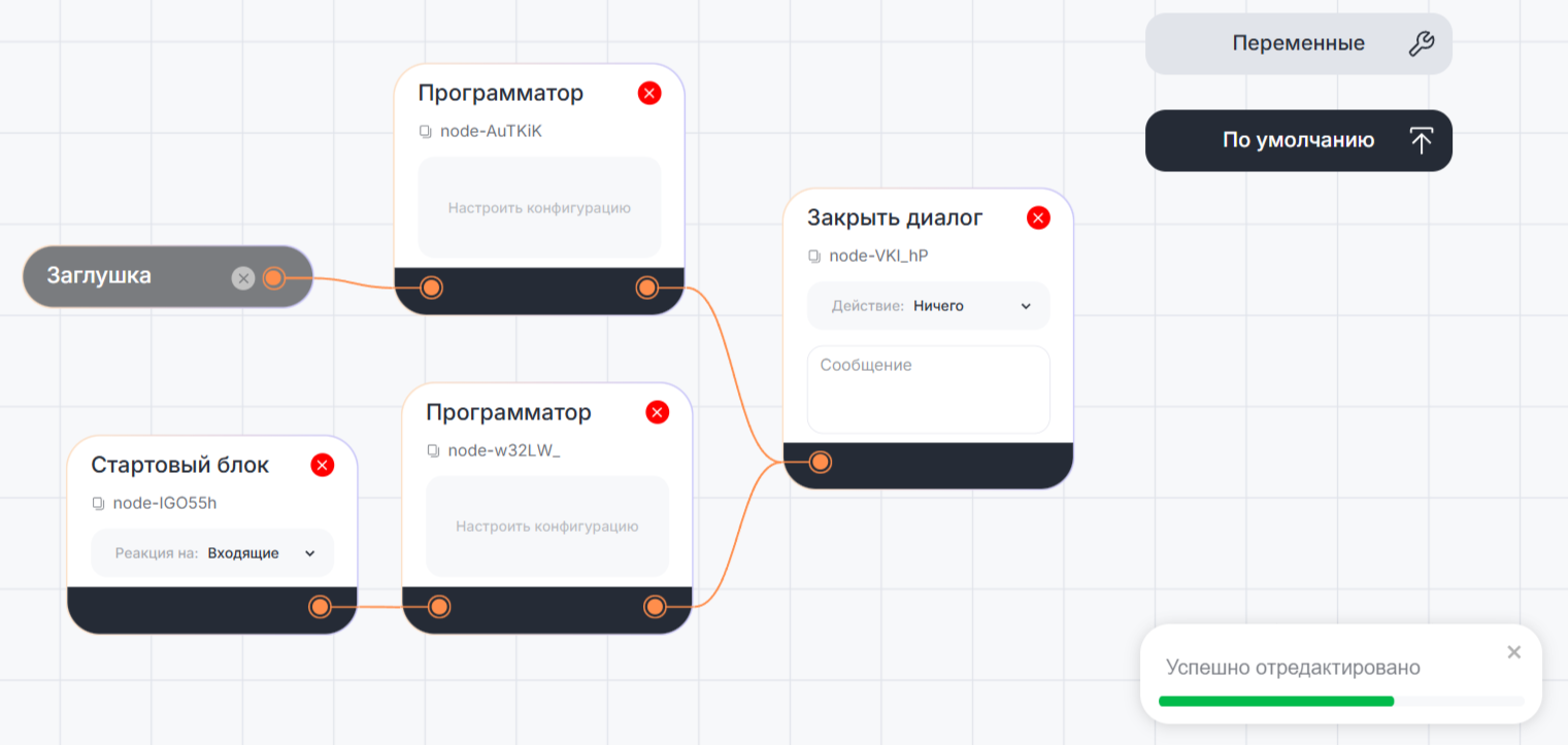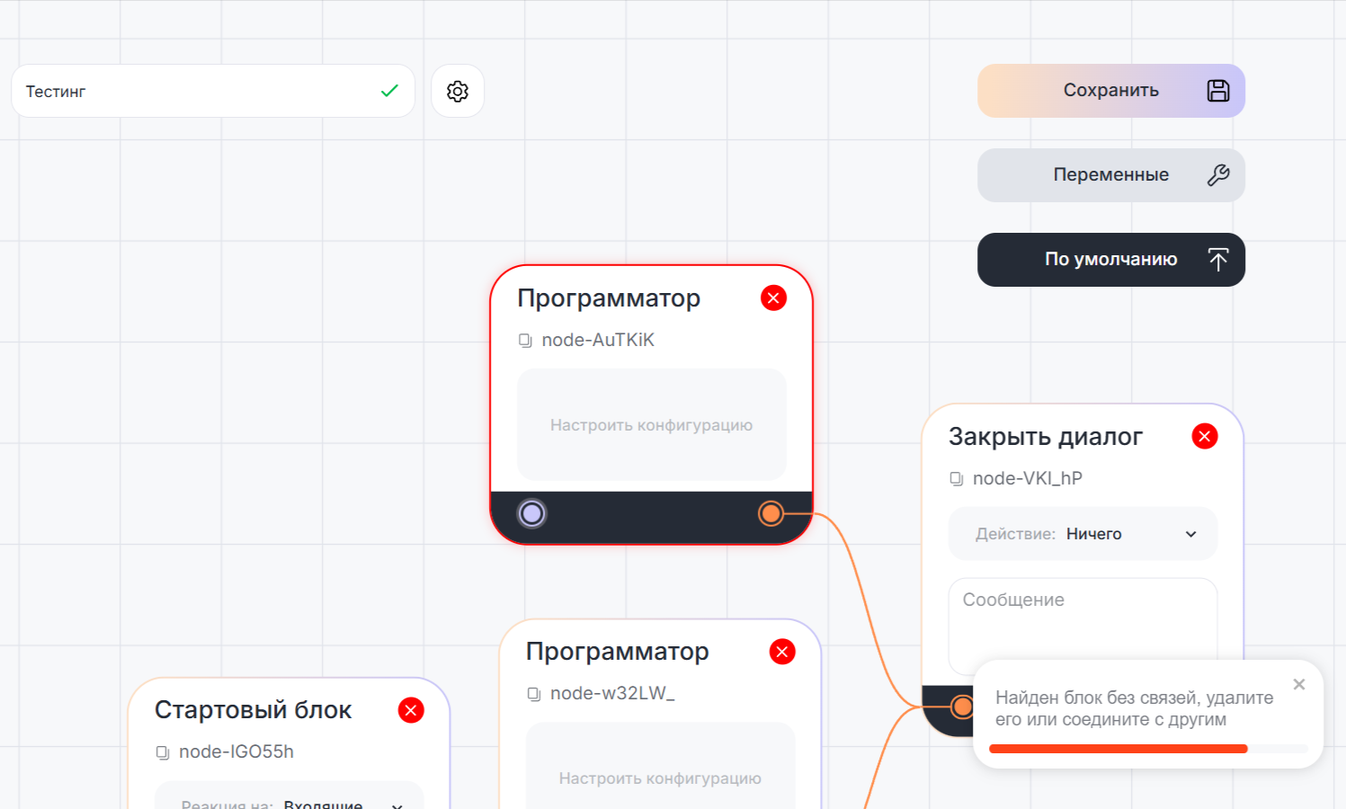Блок «Заглушка» позволяет сохранять сценарии, в которых не хватает связей между блоками. Это актуально, когда вы разрабатываете сценарий и необходимо сохранить неоконченный вариант, чтобы вернуться к нему позже. При попытке сохранить такой сценарий система выдаст ошибку и не позволит это сделать, выделив ошибочный блок.